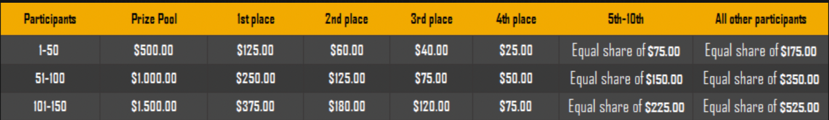 $1,500 Weekend Multiplier Battle Hey, hey, VIPs! We're delighted to announce a Halloween weekend-long battle with the Evoplay provider. The event will occur from October 28, 12:00 pm GMT until October 31, 12:00 pm GMT. To qualify for the prize, you must participate and get the highest multiplier possible on the games listed below. This is your chance to win some candy and show off your skills. So get ready to battle it out and have some fun! - (details further down). Duration: 28/10/2022 12:00pm – 31/10/2022 12:00pm UTC Prize Pool: $1,500 Eligible Games: Play below games to participate in this event: Blessed Flame Wild Overlords Bonus Buy Rueda De Chile Hot Triple Sevens Special The highest multiplier reached in each game will be added together and counted as total points. Bonus buys are allowed. If the player submits multiple winning entries for the same game, the entry with the highest multiplier will be valid. Minimum VIP Tier Must be VIP04 or higher in order to enter this event. Minimum Payout Minimum payout to qualify is 10x (in any game) for a valid entry. Minimum Bet Size Blessed Flame - $0.10 Wild Overlords Bonus Buy - $0.10 Rueda De Chile - $0.10 Hot Triple Sevens Special - $0.10 Eligible Coins All cryptocurrencies are eligible (excepting JB, and BCL). Free Play Mode is not valid for this event. Prize Pool & Reward Breakdown The winners will win a share of the prize pool based on the detailed ranking below. All other participants who complete all minimum requirements will receive a 35% share of the prize pool. How to Enter Access the game to select your Bet ID, click on the Share icon (↷) and then Copy link. Return to the topic, paste the link in the field "Reply to this topic..." E.g.: https://bc.game/#/sd/10VZTGSD9VPUS3 In the same post, upload a screenshot of your win by clicking the game ID WITH VIEW IN USD mode ENABLED (accessible at the bottom of dropdown menu for your wallet up top, and Submit Reply. Done! This way, we can ensure that your bet indeed met the minimum requirement at the time of placing it: https://bc.game/#/sd/10VZTGSD9VPUS3 Additional Rules: Please combine all of your hits together in a SINGLE post. Edit your existing post for additional hits, don't create a new post. Each eligible entry must have the Bet Slip URL, failure to include it will disqualify participation in the event. Bet Slip image is not mandatory. Bets must be posted within 24 hours of placing bet in order to keep things fair for everyone. Bets must be made during the specified time window stated above. This thread will lock automatically when the time period is over. One (1) entry per household. Anyone found attempting to win multiple prizes will be disqualified from this challenge as well as all future challenges. Failure to follow instructions will result in your submission being null and void. By entering this challenge, you acknowledge that BC.Game has the final decision on results and placement. Payouts will be distributed after the event is finished. Please note that it could take anywhere between 24 hours to 7 days after the completion of the event.