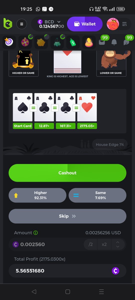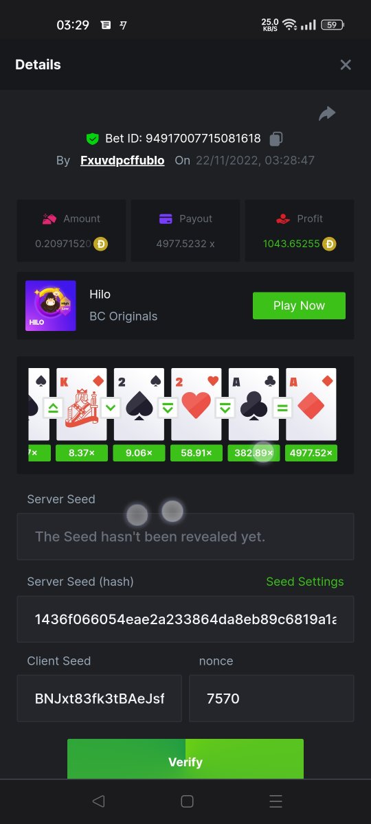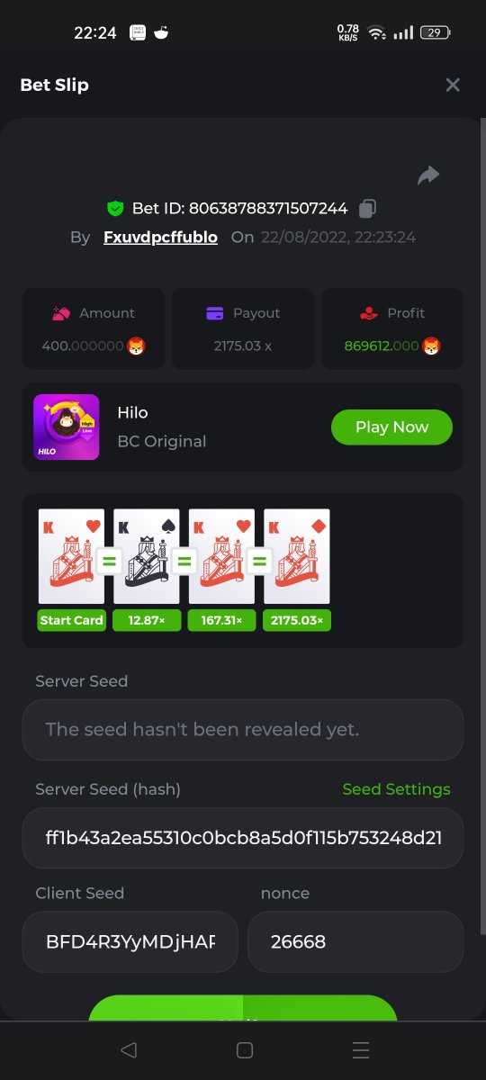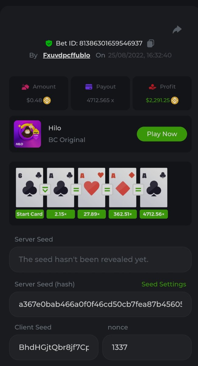 1. Hi fellow Hi-Lo's. Got lucky with 4 A & K .... And! I hit an almost 5000x Please see betlink to view/verify. https://bc.game/#/sd/10XNMKKTI9XXQR Hi everyone I got lucky with Kings and Aces Also had a great win with my almost 5000x multiplyer: here is the betlink https://bc.game/#/sd/10XNMKKTI9XXQR