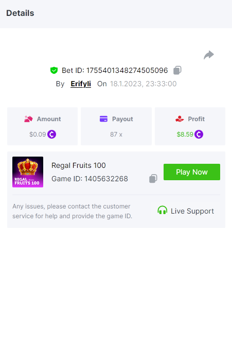Bounty ? https://bc.game/#/sd/1123A7FXI98S9F The exact amount paid in the game was 50x but the multi shown is 0.05 higher than in reality. Not sure if this counts as bounty. https://bc.game/#/sd/1123L1X3SF7YTV https://bc.game/#/sd/111XF58ISYZR4J https://bc.game/#/sd/111X8MPZ776SYB https://bc.game/#/sd/111XAGX5V8YMMR https://bc.game/#/sd/1121WOEHI0AT5F https://bc.game/#/sd/111XKLL6U67THV