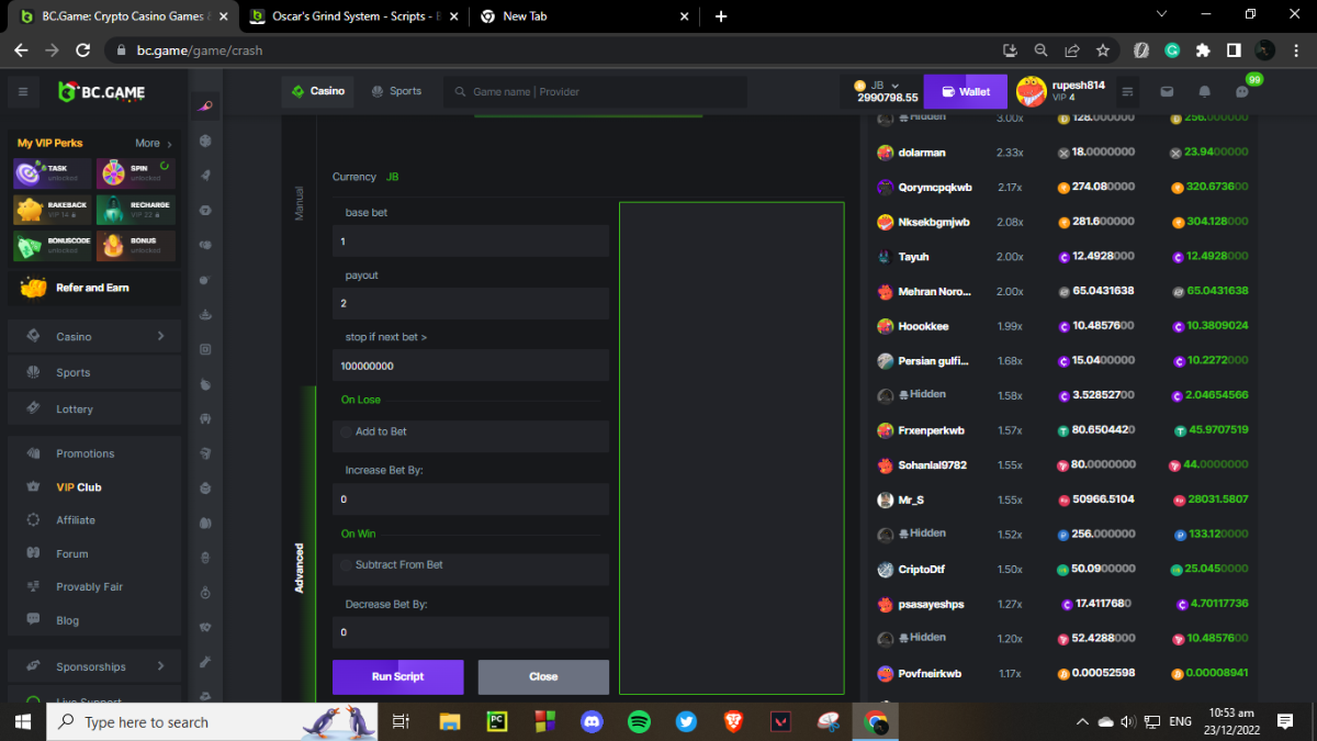 rupesh814 Posted December 22, 2022 Share Posted December 22, 2022 On 11/9/2022 at 4:55 AM, Skele said: what game do you want it in or rather client script or sandboxed and for what game. I will just translate it into a generic sandboxed one that can be used for crash or hash-dice for now. can you help me with d'Alembert betting stratergy in which i can add bet on losing and subtract from bet on winning. Link to comment Share on other sites More sharing options...
