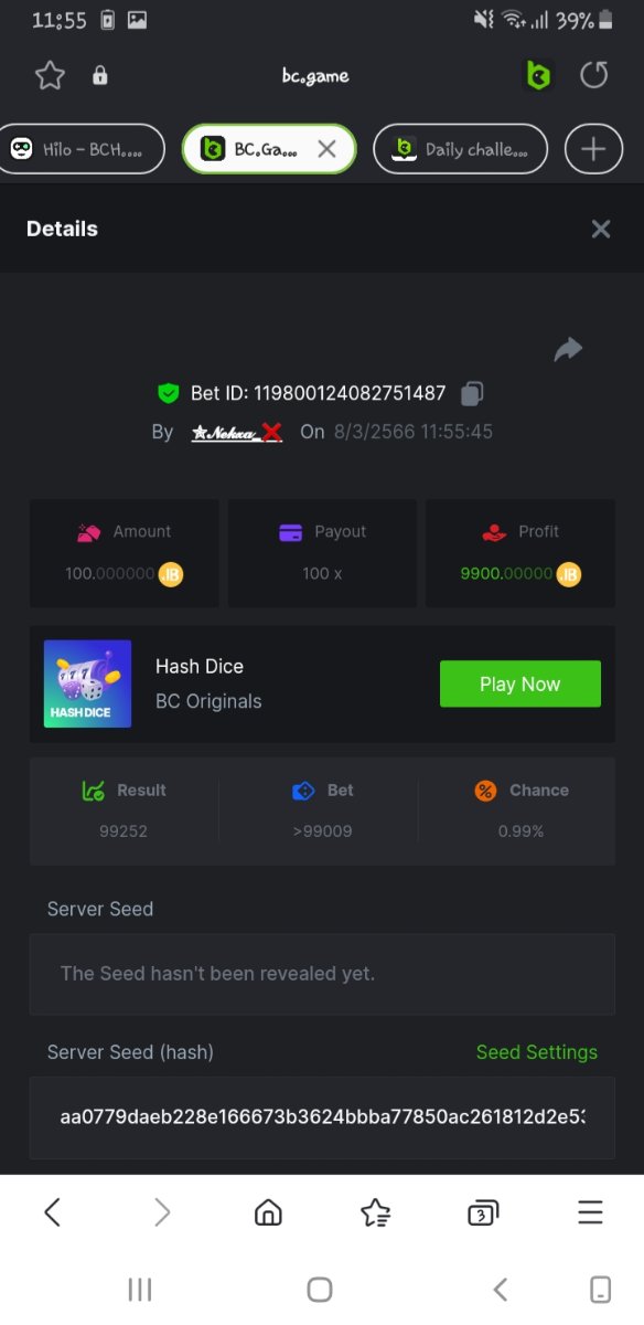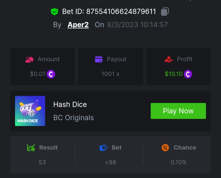 Maksypro Posted March 8, 2023 Share Posted March 8, 2023 Read Carefully Before Start To Hunt Daily Challenges #168 HASH DICE Hunt : Win the highest pay out Min Payout requirement 100x Min Level 4 ๏ธDuration Starting : Now End time : 23.59 UTC Time How to Join? Make screenshot + paste your bet link + UID or Profile link Mini bet amount - 0.01$ Any coin allowed Reward Prizes 1st Place.....$7 BCD 2nd Place.....$5 BCD 3rd Place.....$4 BCD 4th Place.....$3 BCD 5th Place.....$2 BCD ๐ต Winners will be announcing next day after Roll Point! 1 Link to comment Share on other sites More sharing options...