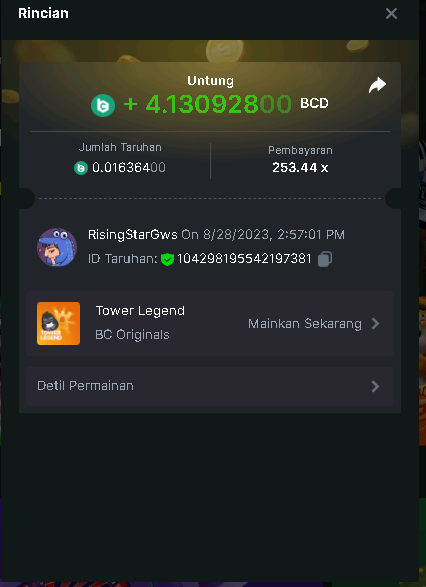 Moderator Giandreas Posted August 28, 2023 Moderator Share Posted August 28, 2023 Read Carefully Before Start To Hunt Forum Daily Challenges #341 Tower LegendHunt : Tower Legend Win the highest pay out Min Payout min 13x Min Level 4️Duration Starting : Now End time : 23.59 UTC Time How to Join? Make screenshot + paste your bet link + UID or Profile link Any coin, with min bet 0.01 USD is allowed (jb/bb/bcl not allowed)Reward Prizes 1st Place.....$7 BCD 2nd Place.....$5 BCD 3rd Place.....$4 BCD 4th Place.....$3 BCD 5th Place.....$2 BCD 🏵 Winners will be announcing next day after Roll Point! 1 Link to comment Share on other sites More sharing options...