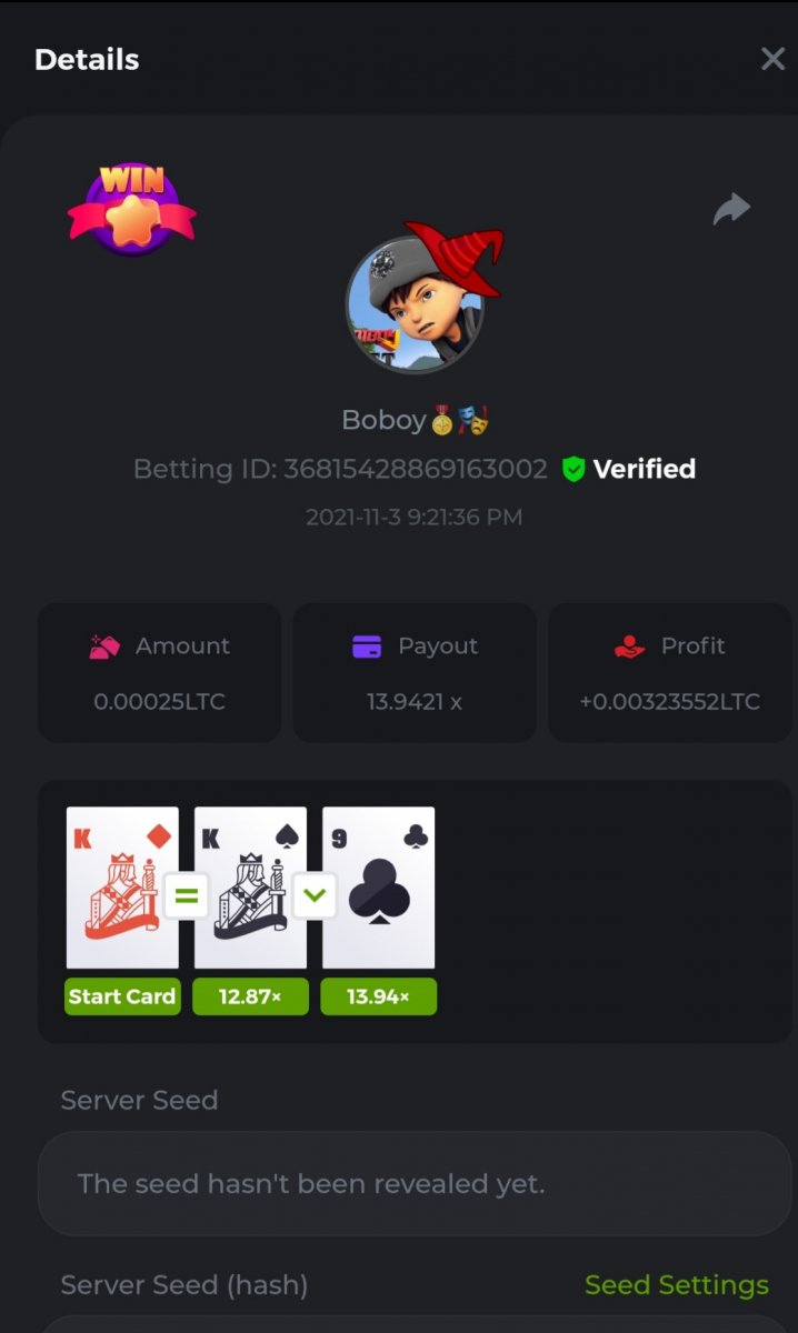WOUNDED Posted November 3, 2021 Share Posted November 3, 2021 Small challenge #4 Every week,along to the prestige & top challenge,we have a side challenge for you We have considered HILO game for this week (We have prepared a special option Whoever earns more points this month،will receive a $ 20 prize at the end of the month) First place Second place Third place Starts: 21:00, November 3 GMT Ends: 21:00, November 6 GMT What's the Challenge? Earn 2 king cards in a row Minimum VIP Tier Must be VIP4 or higher in order to enter this challenge. Minimum Bet Size $0.05 USD equivalent (please check the individual coin amounts below) - Bets made below this amount will not count Eligible Coins All coins are eligible (excluding JB) Available Prizes 1......$20 2......$15 3......$10 To enter,copy the bet ID of the bet you'd Once you've copied it,post it as a reply to this thread like so: Betting ID:39689264501358651 In the same post,upload a screenshot of your win by clicking the game ID WITH VIEW IN USD mode ENABLED (accessible at the bottom of dropdown menu for your wallet up top.this way,we can ensure that your bet indeed met the minimum requirement at the time of placing it The one with the highest base amount wins In a tie,the one who submits the bet faster will be declared the winner Bets must be posted within 24 hours of placing bet in order to keep things fair for everyone Bets must be made during the specified time window stated above. This thread will lock automatically when the time period is over Each user is only allowed with one account Otherwise,the wrongdoer will be dealt with Failure to follow instructions will result in your submission being null and void Payouts will be made within 24 hours of challenge completion,please be patient Let's goGood luck Betting ID:39689264501358651 Link to comment Share on other sites More sharing options...