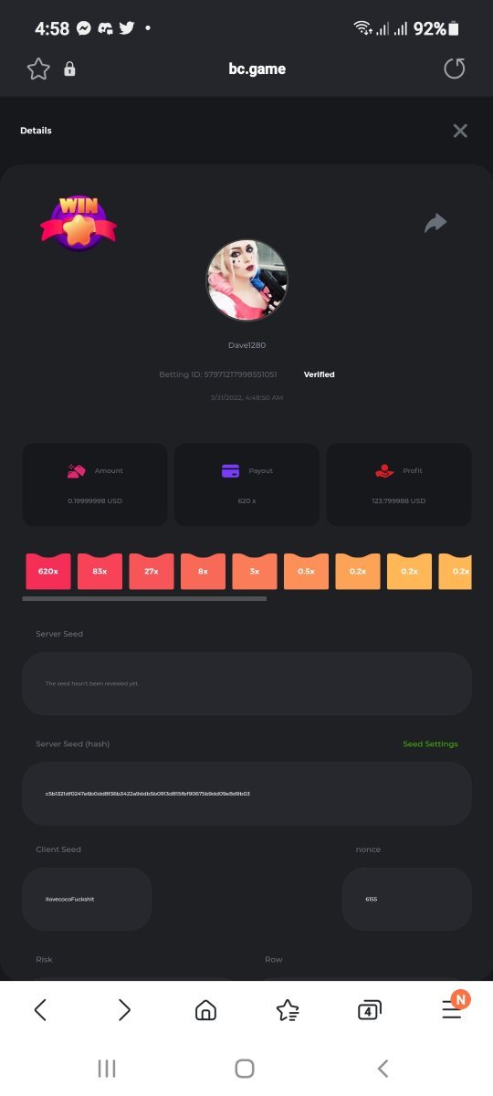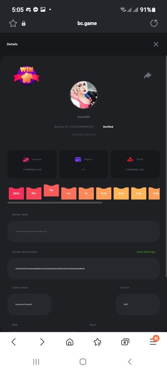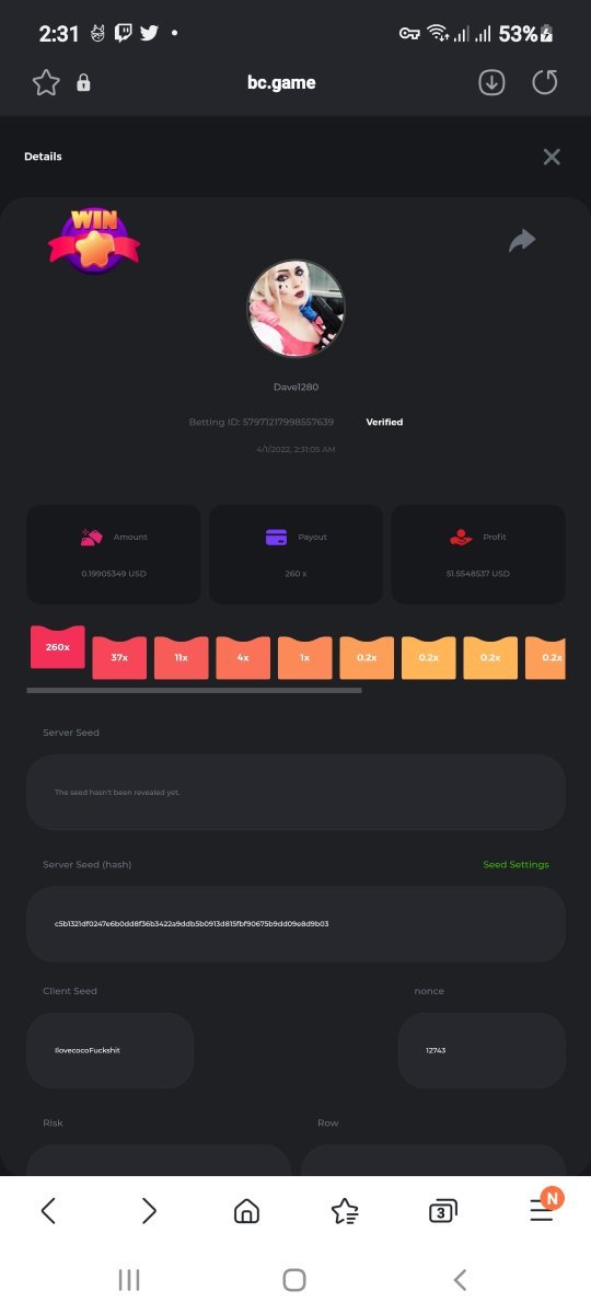 About 4 months back I deposited 100 doge, worked it up to 2k doge then swaped to bcd and worked that up to 2k vaulted 1k just in case. Decided to jump on classic dice with a brand new seed betting 1 bcd hunting for that elusive 9900x multi. In 17 nonce the betting stopped when I hit the 9900x putting me over 12k bcd total. Swaped back to doge and celebrated with a withdrawal.